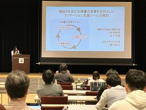 タイトル:曖昧さを含む仕様書の改善を目的としたアノテーション支援ツールの検討著者:○杉本麻衣,松下光範,藤代裕之 解説:社会学などでは、ニュース記事などを分析するために「アノテーション」を行います。これは文章中の言葉に、マーカーで線を引くようにタグ付けをする作業のことです。でも、例えば「記事内の『欲しい』は感情的ですか?」と聞かれたら、人によって意見が分かれますよね? こうして判断がバラバラになると、客観的なデータとして扱えず、正しい分析ができません。本研究では、このズレの原因は人のスキルではなく「ルールの曖昧さ」にあると考えました。開発したツールは、作業者同士が「どこで意見がズレたか」を可視化してルールの不備を直せます。この修正を繰り返すことで、誰もが同じ基準で判断できる「良いルール」へと改善していけることを実証しました。